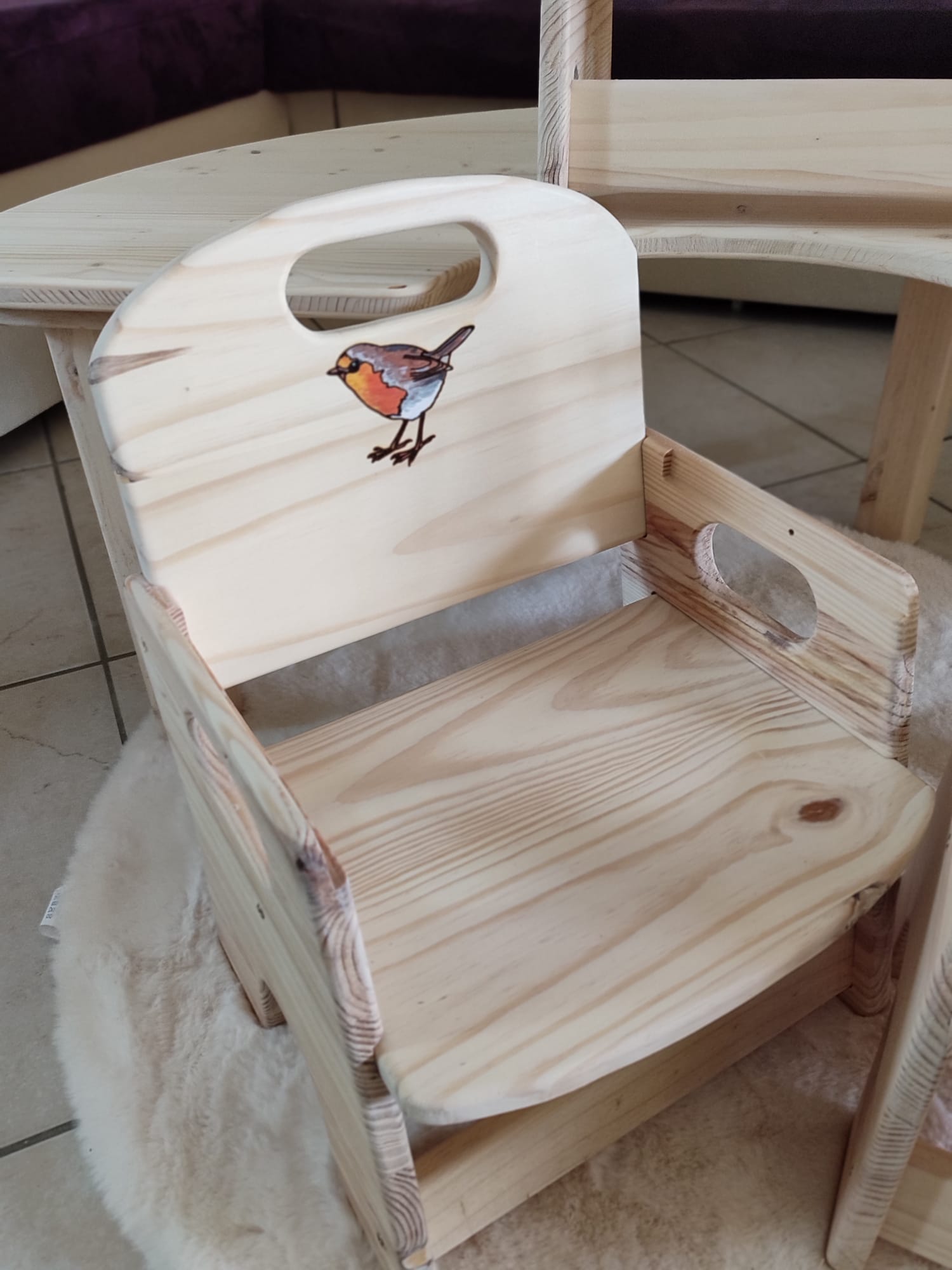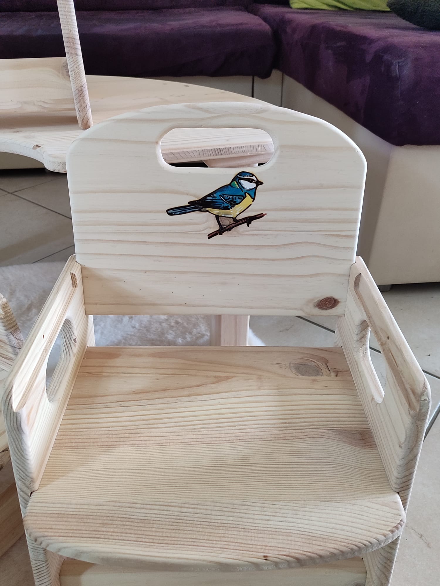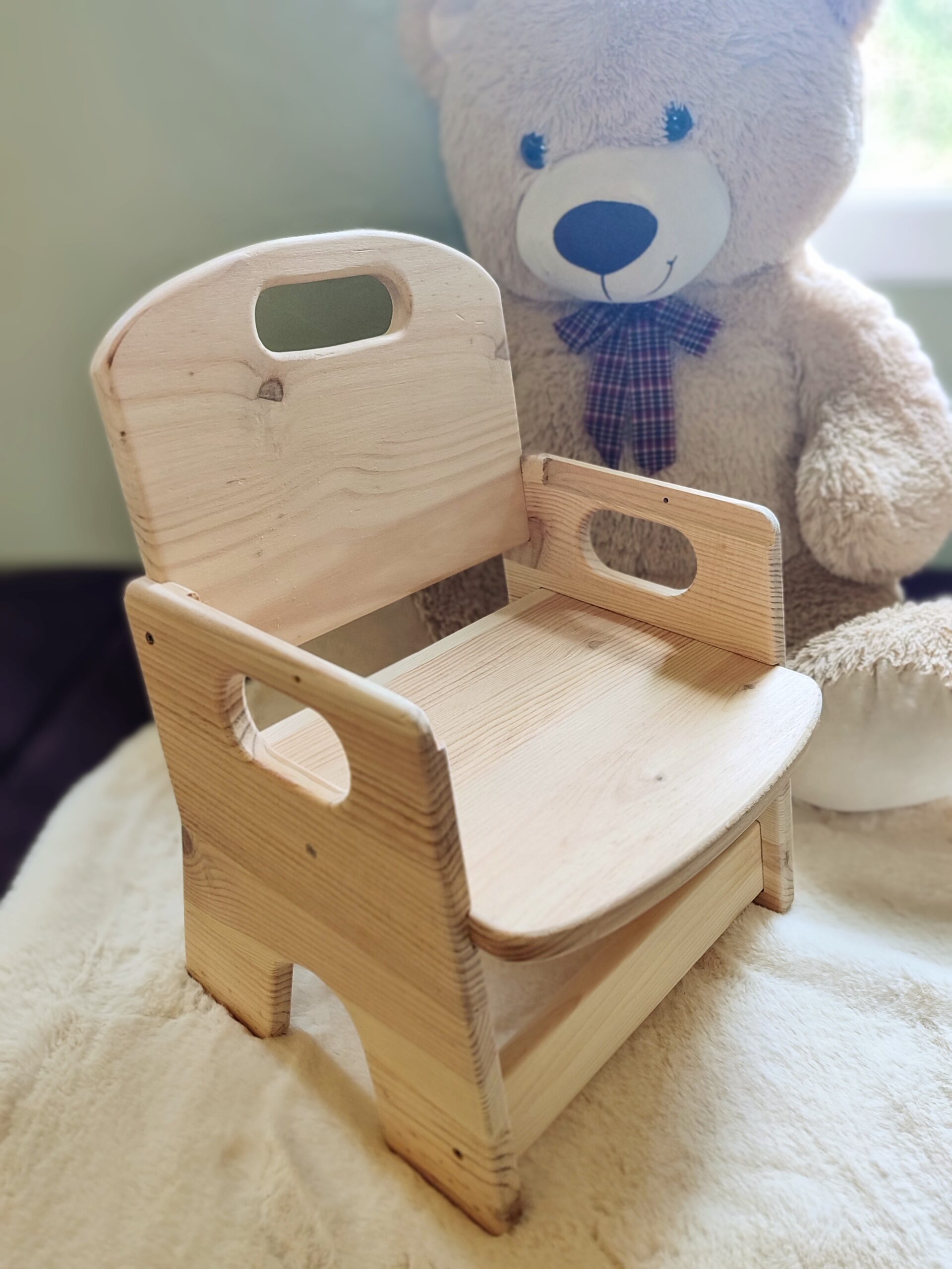 J’utilise du bois brut de Pin FSC (pas d’aggloméré ou autre), un vernis norme jouet, des vis de qualité, pas de colle, tout est vissé et démontable. Tout est fait à la main (les miennes 🙂), poncé et arrondi pour celles des enfants, vérifié et revérifié dans les moindres détails. Je teste chaque chaise en y montant moi même dessus, donc elles supportent au moins 80 kg. J’ai passé énormément de temps à élaborer le design et l’ergonomie de chaque modèle grâce à mes filles qui les ont testé. Je les améliore régulièrement d’ailleurs. Les petites chaises ont 2 niveaux d’assise différents pour évoluer avec l’enfant. (de 1 à 10 ans environ). Un adulte peut s’asseoir dessus sans problème pour jouer avec un enfant par exemple. Je propose la gravure du prénom de l’enfant sur le dossier de la chaise , ainsi que le vernissage norme jouet.