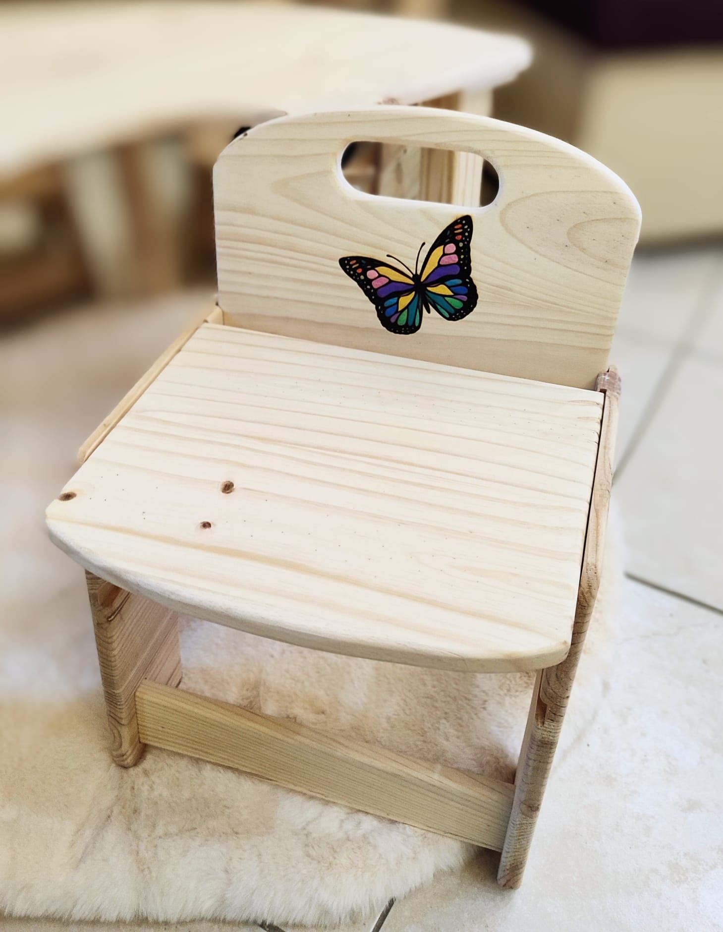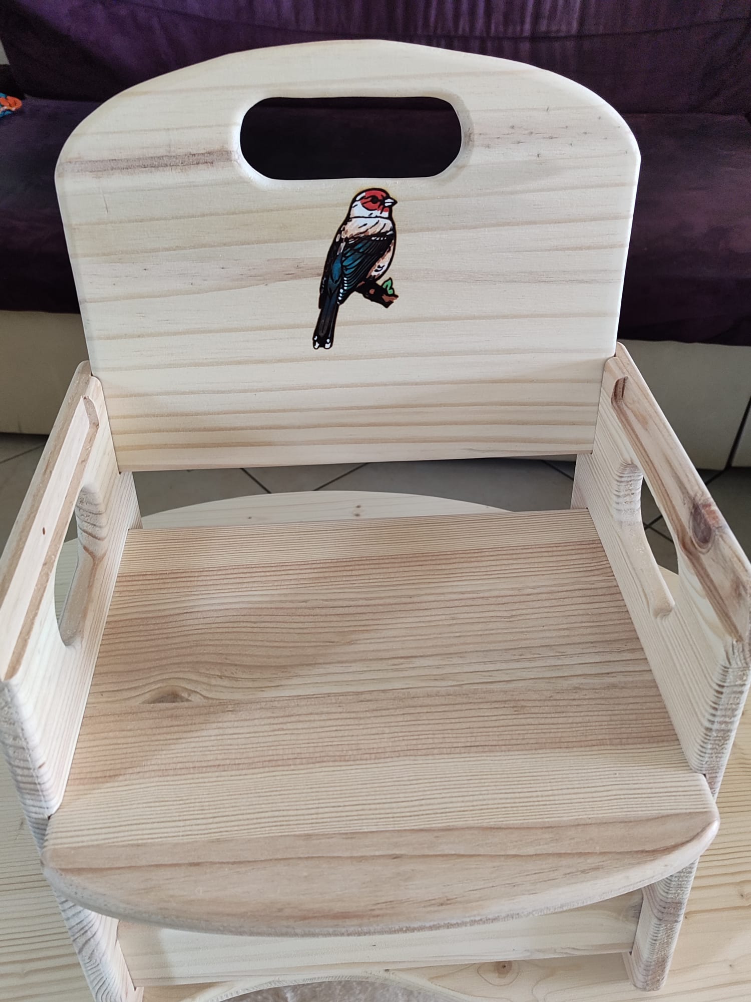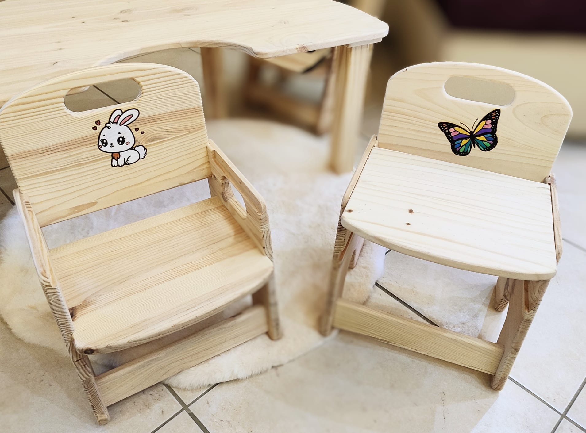 J’utilise du bois brut de Pin FSC (pas d’aggloméré ou autre), un vernis norme jouet, des vis de qualité, pas de colle, tout est vissé et démontable. Tout est fait à la main (les miennes 🙂), poncé et arrondi pour celles des enfants, vérifié et revérifié dans les moindres détails. Je teste chaque chaise en y montant moi même dessus, donc elles supportent au moins 80 kg. J’ai passé énormément de temps à élaborer le design et l’ergonomie de chaque modèle grâce à mes filles qui les ont testé. Je les améliore régulièrement d’ailleurs. Les petites chaises ont 2 niveaux d’assise différents pour évoluer avec l’enfant. (de 1 à 10 ans environ). Un adulte peut s’asseoir dessus sans problème pour jouer avec un enfant par exemple. Je propose la gravure du prénom de l’enfant sur le dossier de la chaise , ainsi que le vernissage norme jouet.